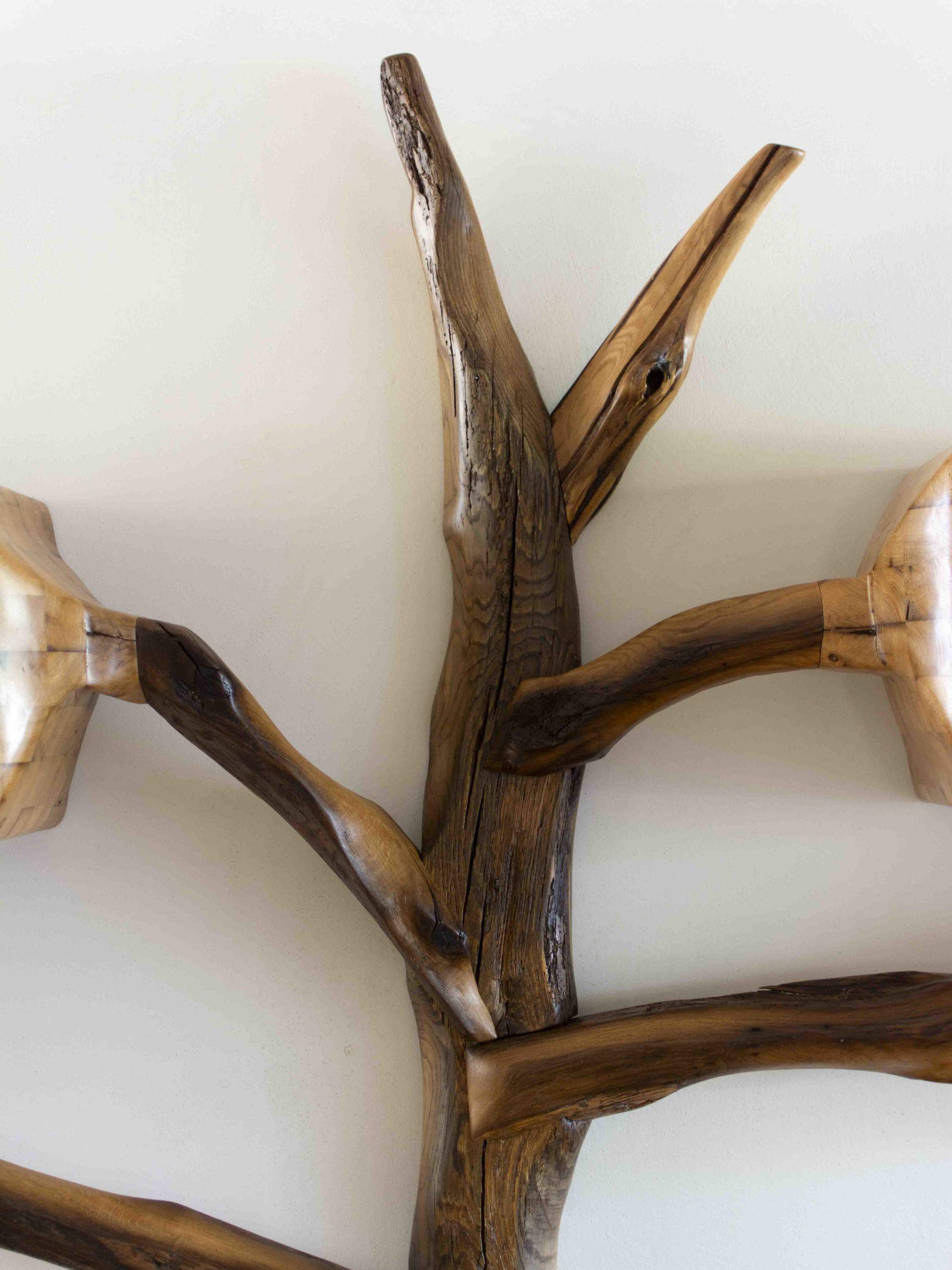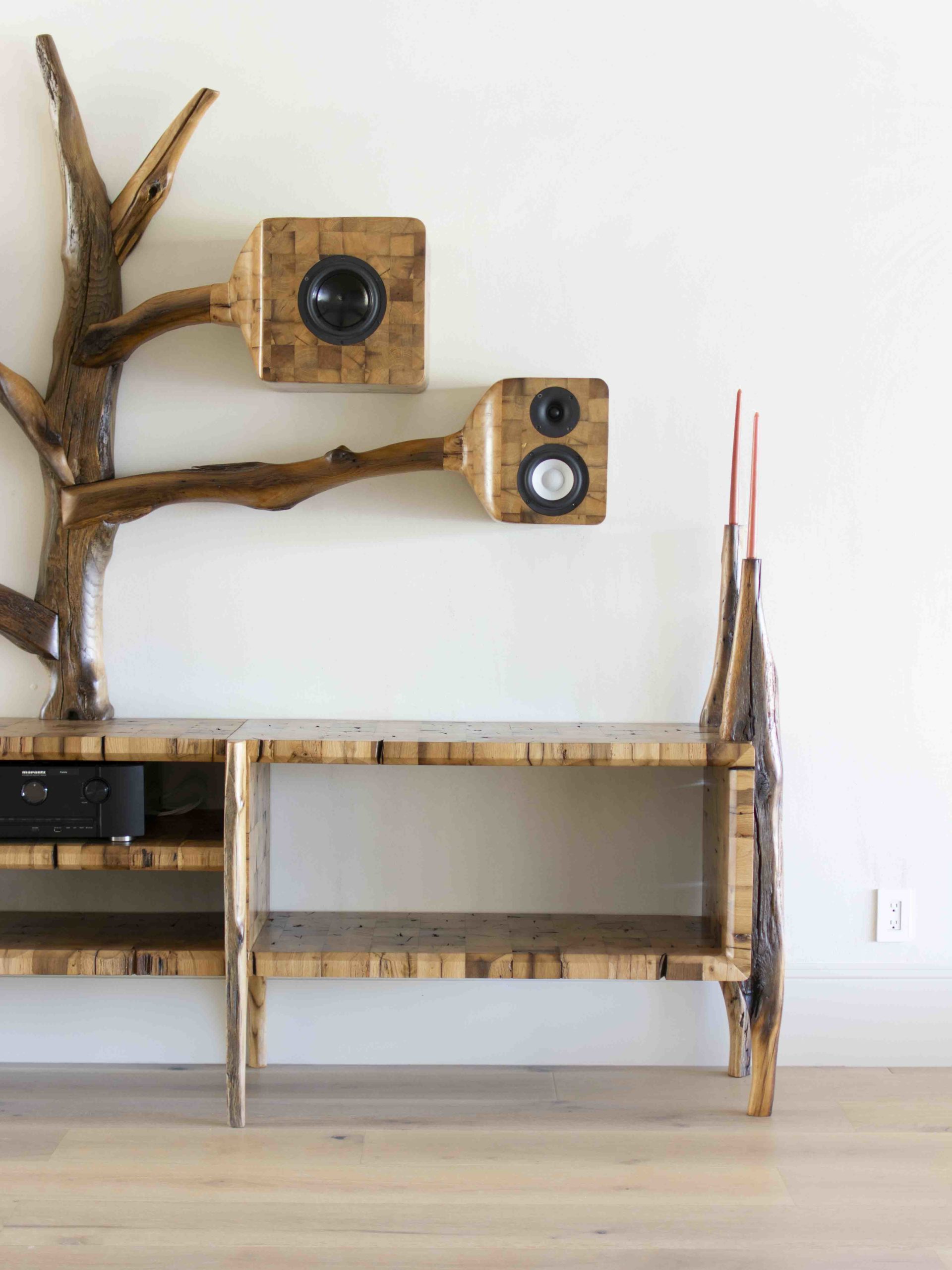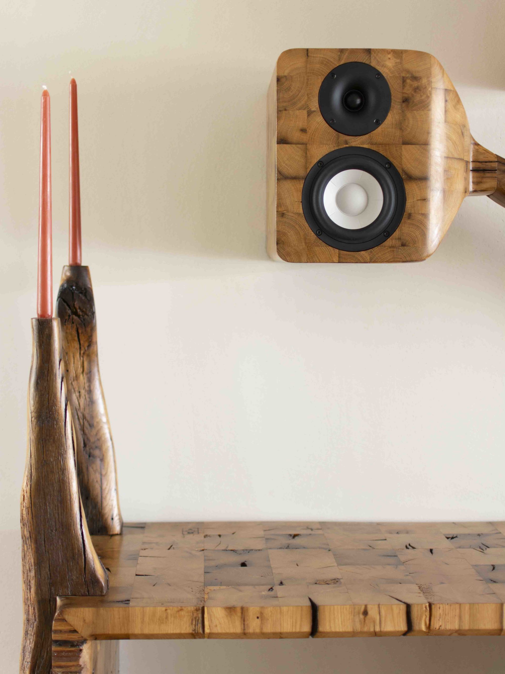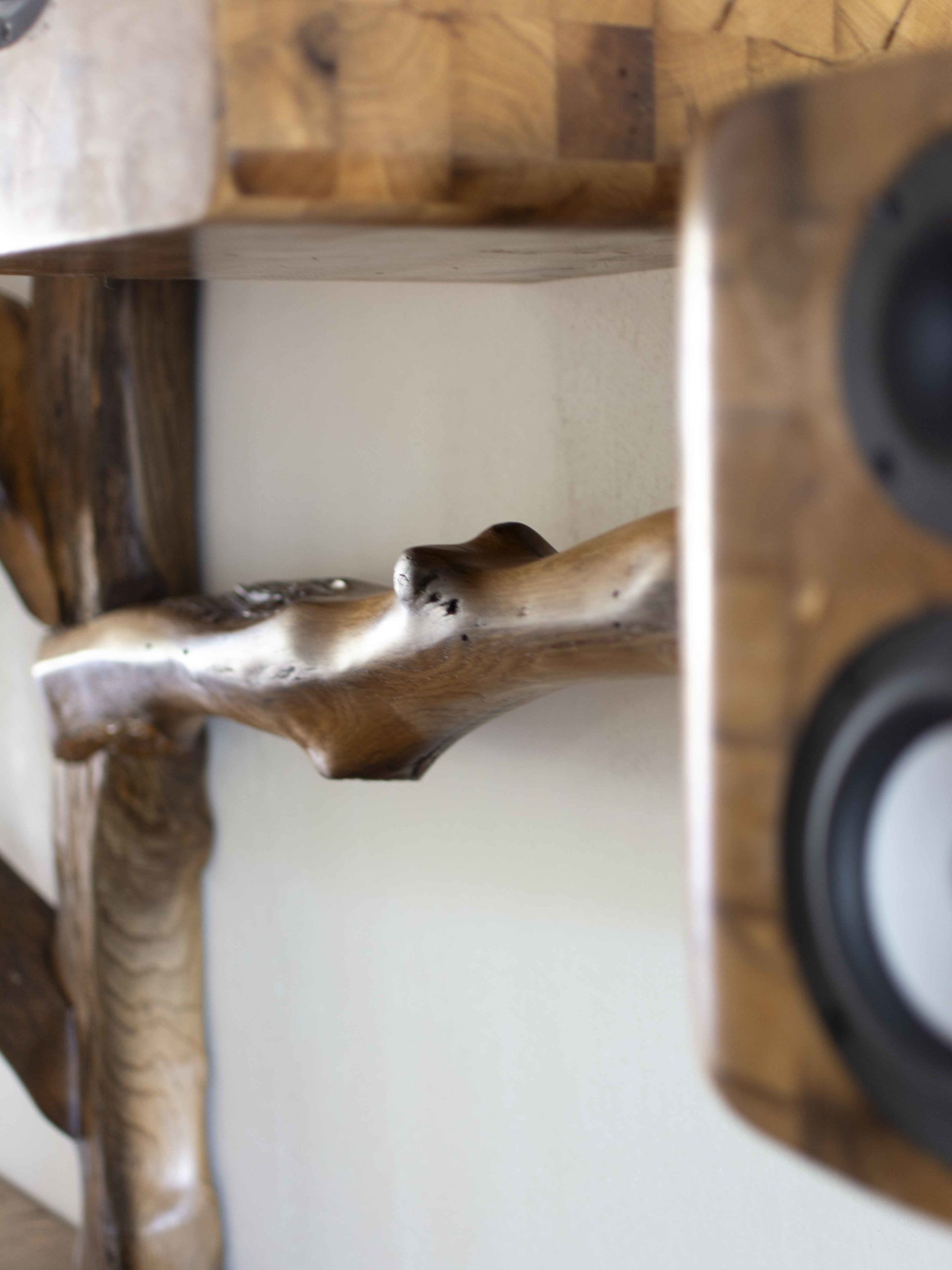 True to my attachment to sacredness, the outer legs are elongated above the sideboard and end in candle holders, giving a religious yet personal meaning to the tree-like ensemble. I saw the storage space and its contents as the roots. The central trunk symbolizes the common, universal basis of music, while the branches represent the diversity of music.